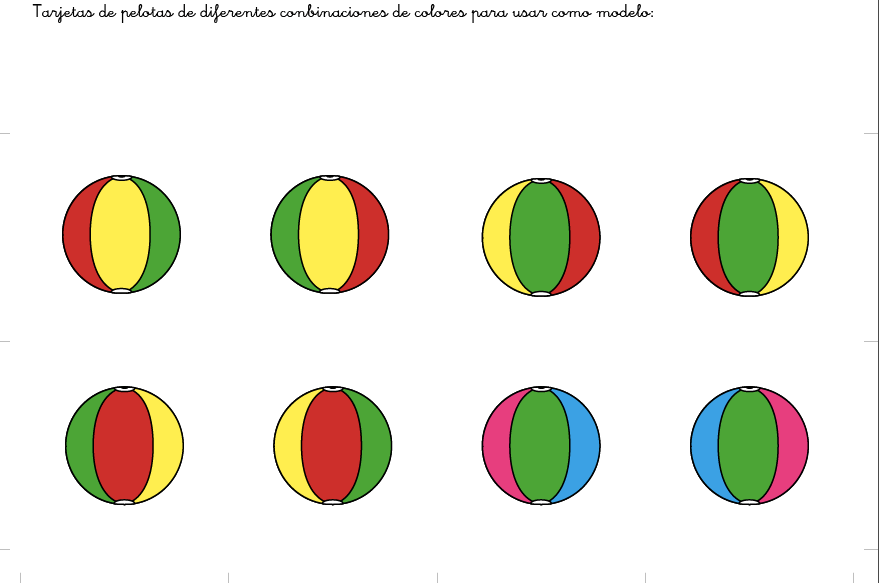 - 18 páginas con todas las combinaciones de colores en los balones. Estas páginas no es necesario imprimirlas para el juego, pero las tenéis como referencia
